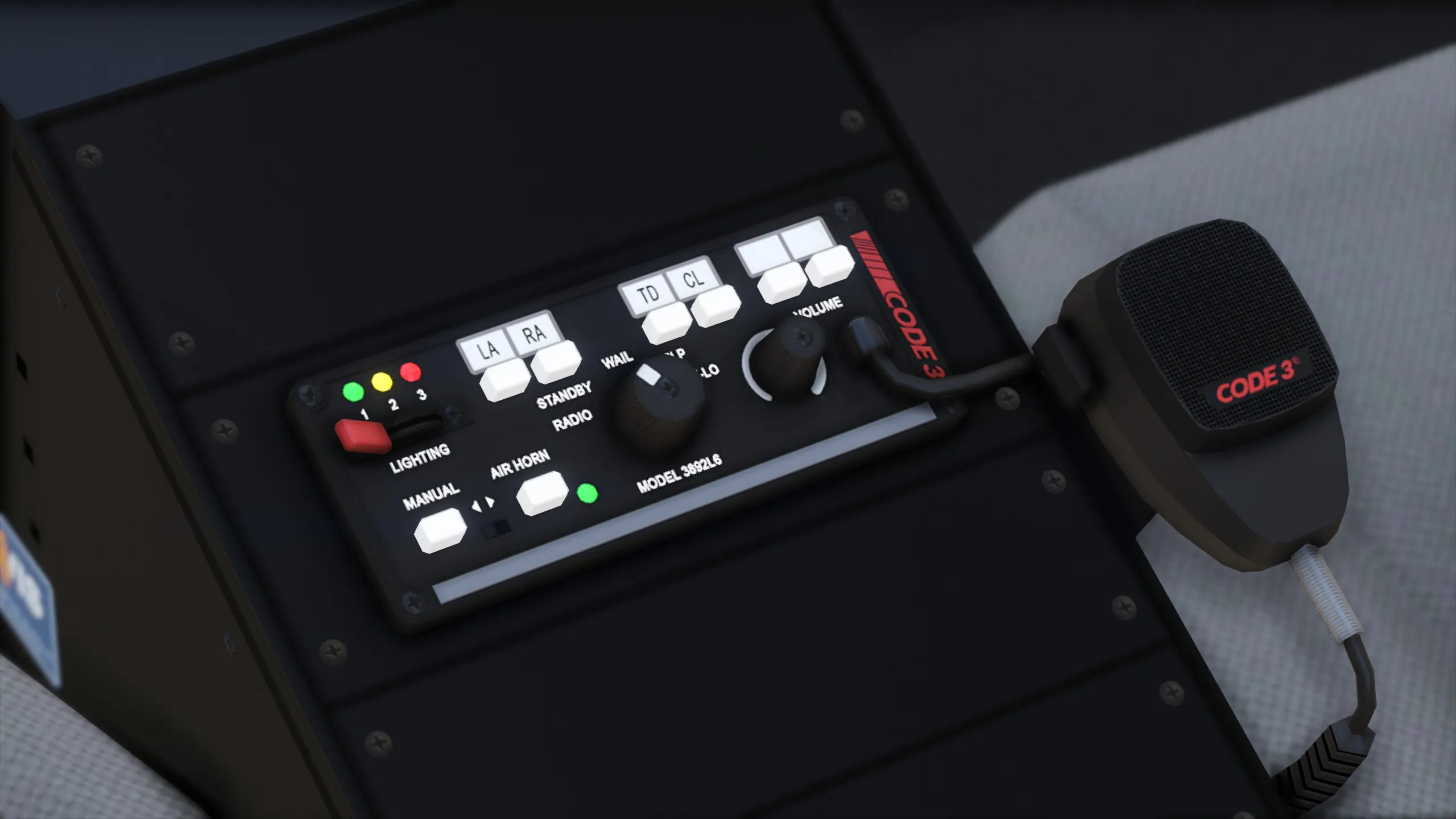 A Code 3 Mastercom siren controller and its microphone. Can be used with the ArrowStik control box.