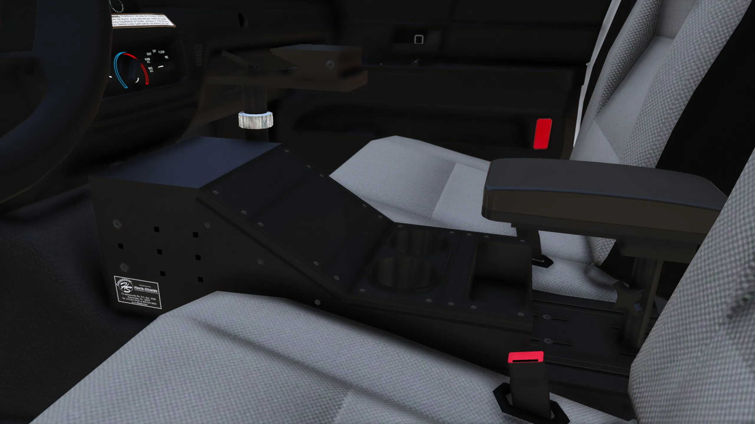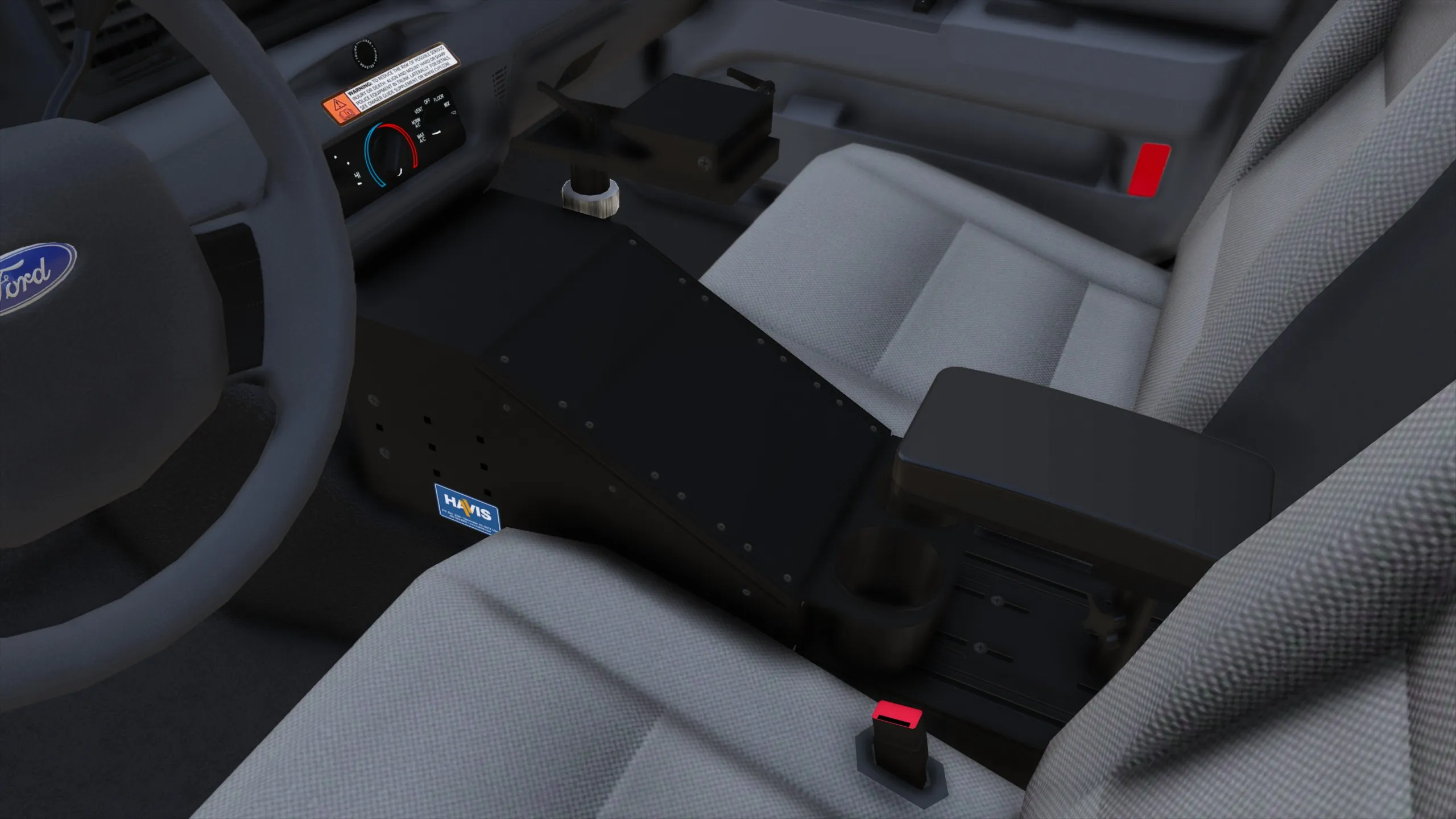 Havis consoles for the 1998-2011 Ford Crown Victoria Police Interceptor. Includes a tunnel plate with 12” angled, 8” angled, 8” flat, armrest, and cupholder modules as well as a laptop mount. Both the old Havis Shields Consolidator and the new Havis logo sticker textures are included.