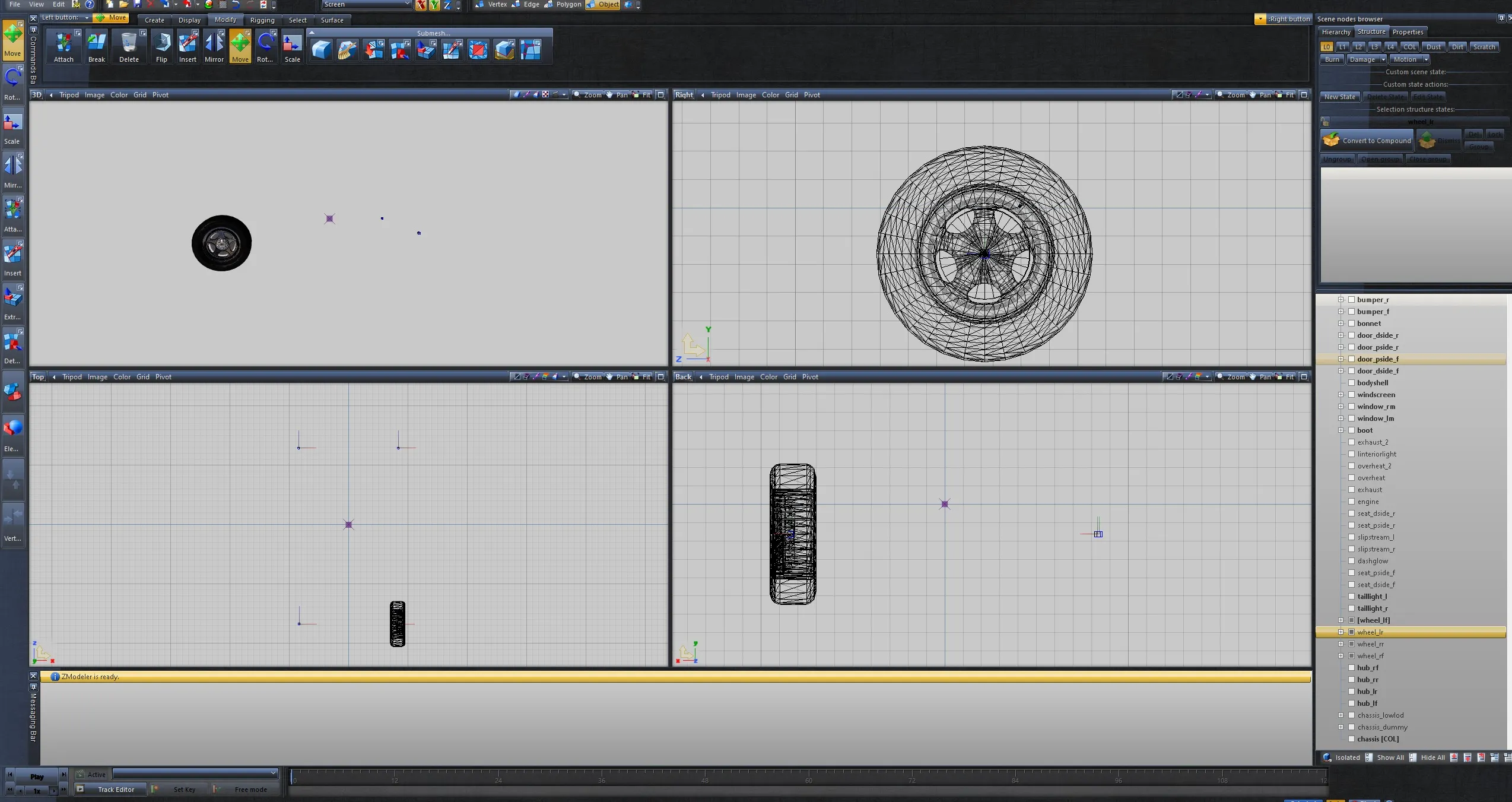 1. Rename [Wheel_LF] to something different to prevent issues and merge in the one from the stock .z3d that came with the base and move the materials to the correct positions in the hierarchy.