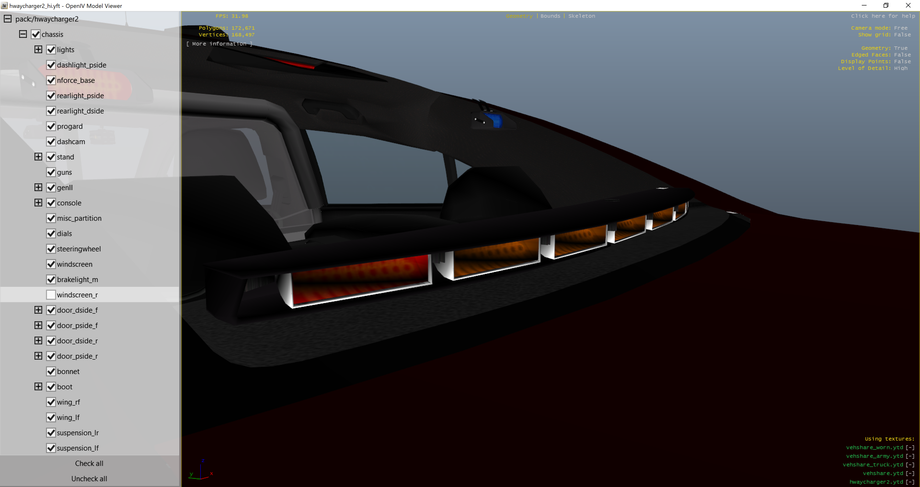 • So I made this slicktop Charger to go along with my MSP-based SAHP pack, but when I spawn the vehicle, the game crashes with that error. I have narrowed the problem down to the nFORCE rear bar, when I delete it, it spawns just fine. I cannot figure out what about that light module makes the game crash. I have noticed that in OpenIV, the actual individual light modules don't display properly and are white instead of the expected texture, even though the texture is present in the YTD.