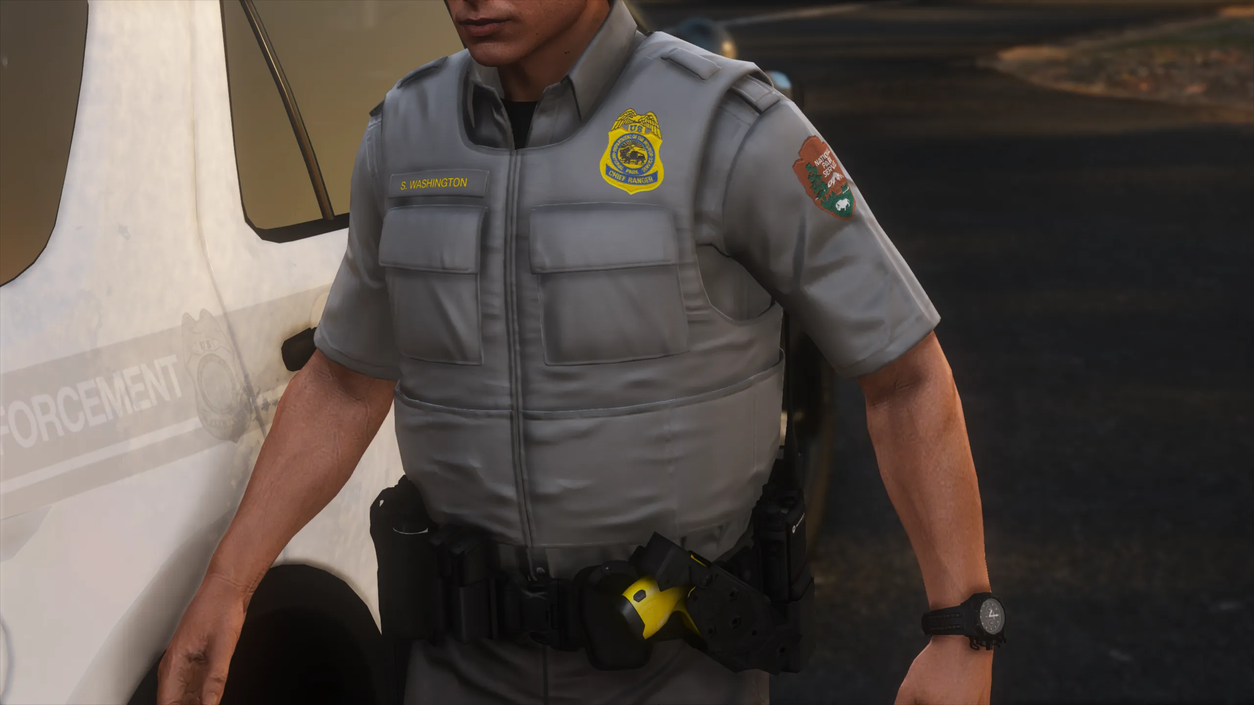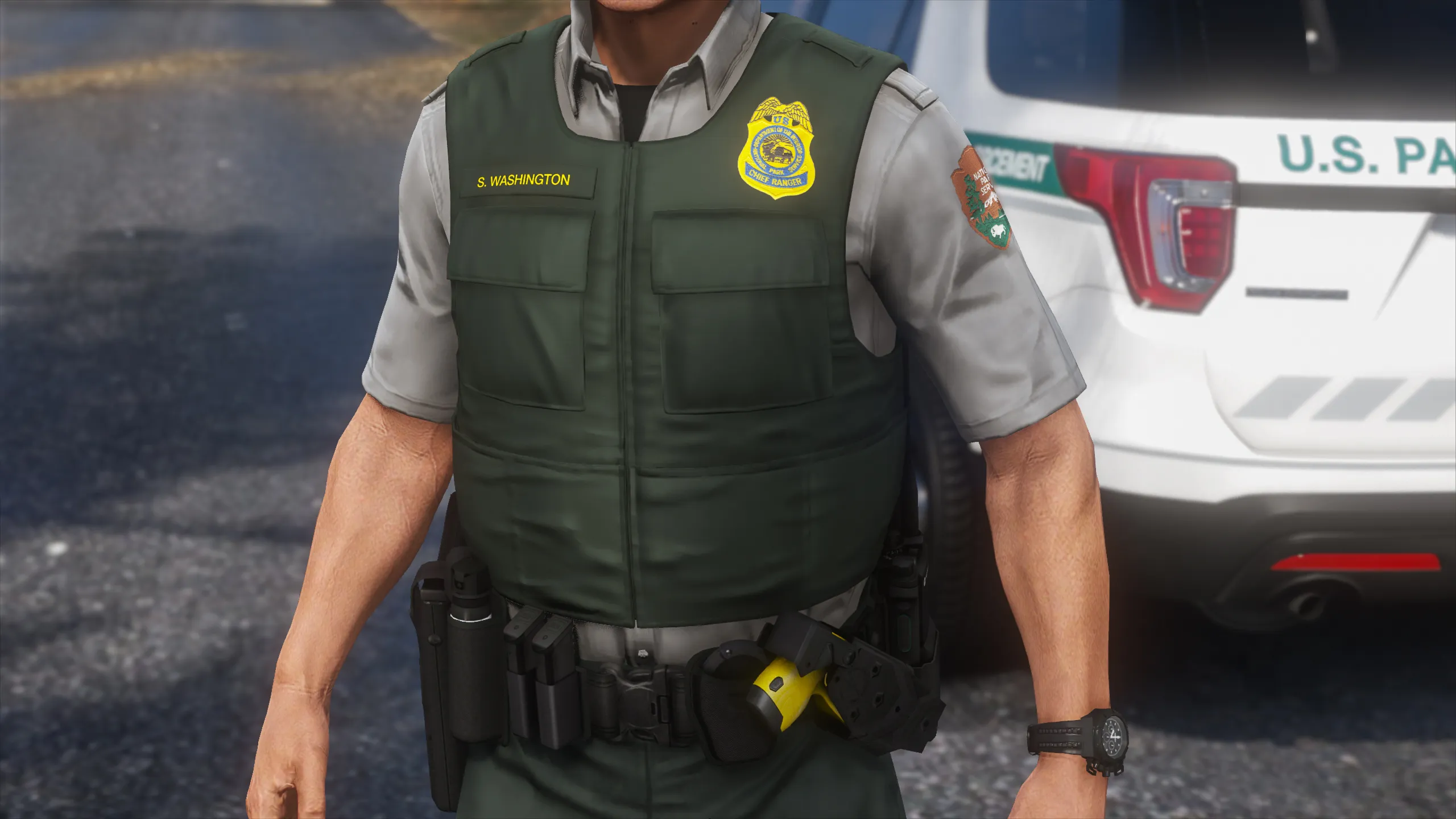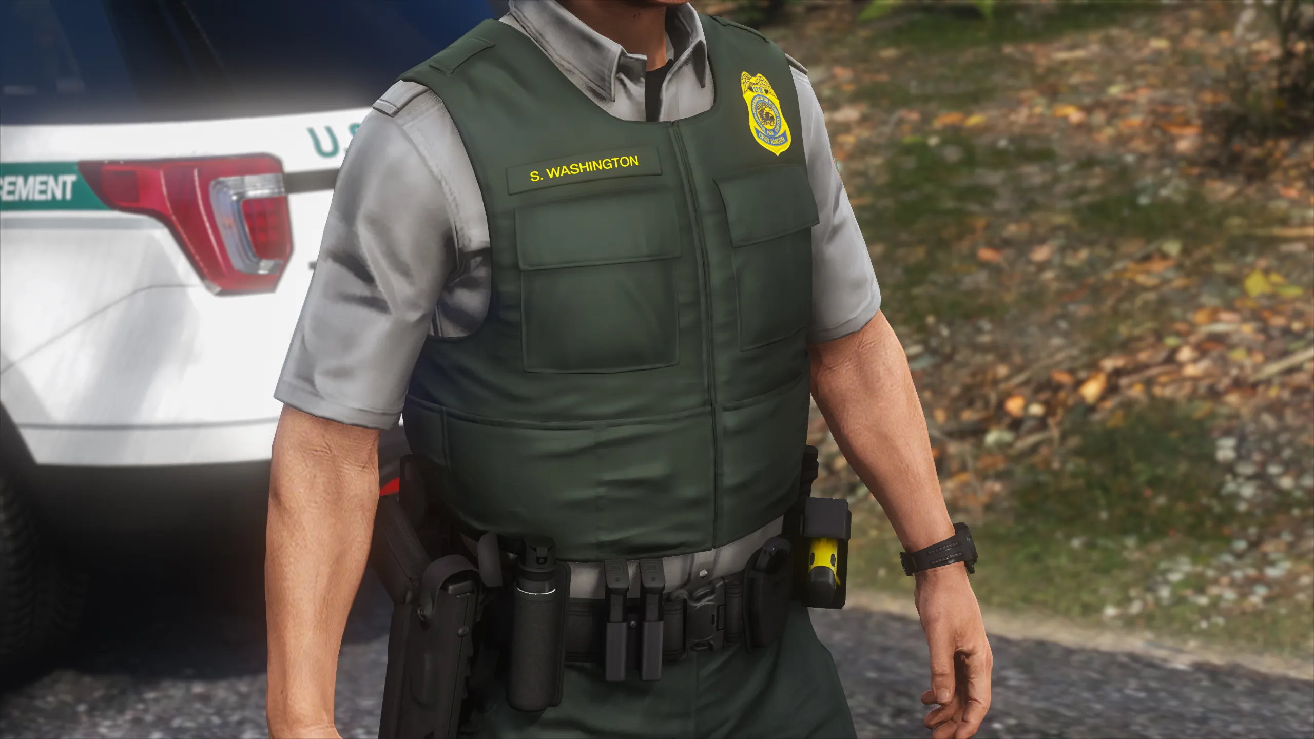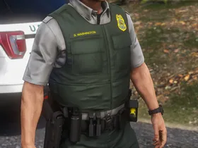 I started this project a long time ago when Ranger Rick got me interested in Federal Land Management LE. Since then I've learned a lot and gained new skills and techniques until I arrived at a result I was happy labeling as completed. There is a lack of vests in GTA that are lighter-duty and don’t look like you’re gearing up for war. This vest is perfectly minimal and utilized by US Forest Service, US National Park Service, US Fish and Wildlife Service, and the Alaska State Troopers. The vest was minimized to a low poly count and includes 3 LOD's for in-game optimization. Huge shoutout to Agent's Workshop for keeping me motivated throughout my struggle with this project, his amazing screenshots, and the textures he made for his NPS pack!