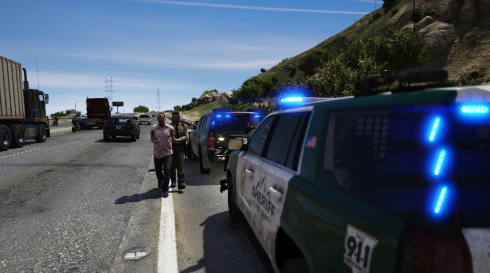 A backup unit takes an arrested individual to his overly dirty Tahoe.